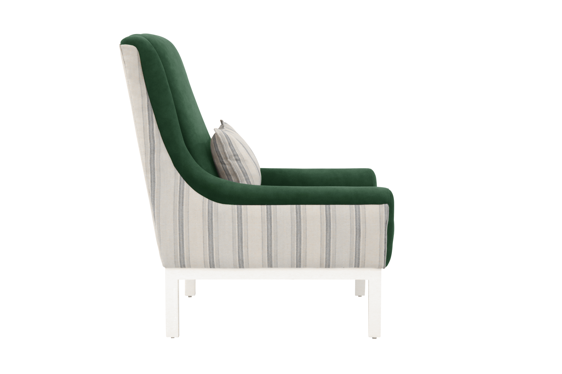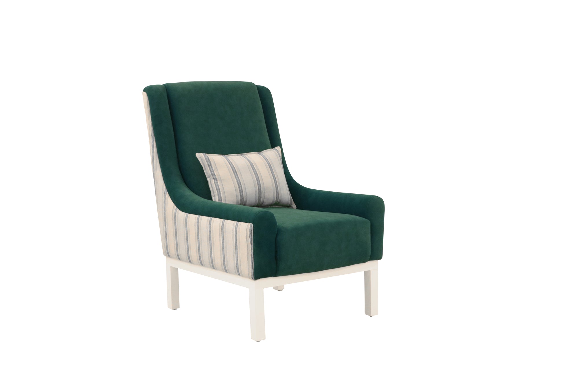 Sail into comfort with the Emerald Harbor Lounge Chair, where modern design meets timeless coastal elegance. Featuring a deep emerald green seat paired with breezy striped upholstery on the sides and a matching lumbar cushion, this chair brings both sophistication and a sense of relaxed living.