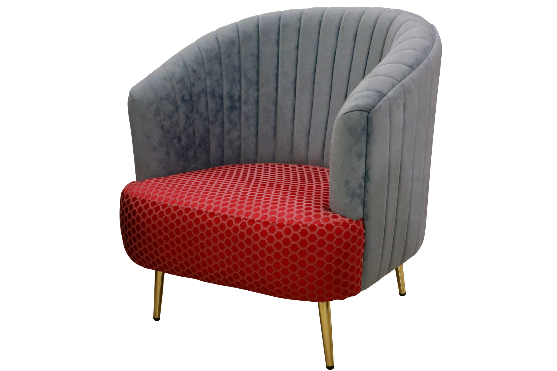 Bring home a chair that does more than just offer comfort—it makes a statement. The Aurora Barrel Chair flaunts a plush velvet shell in cool grey, beautifully contrasted by a vibrant honeycomb red seat. Perched on sleek golden legs, it exudes retro charm with modern flair.