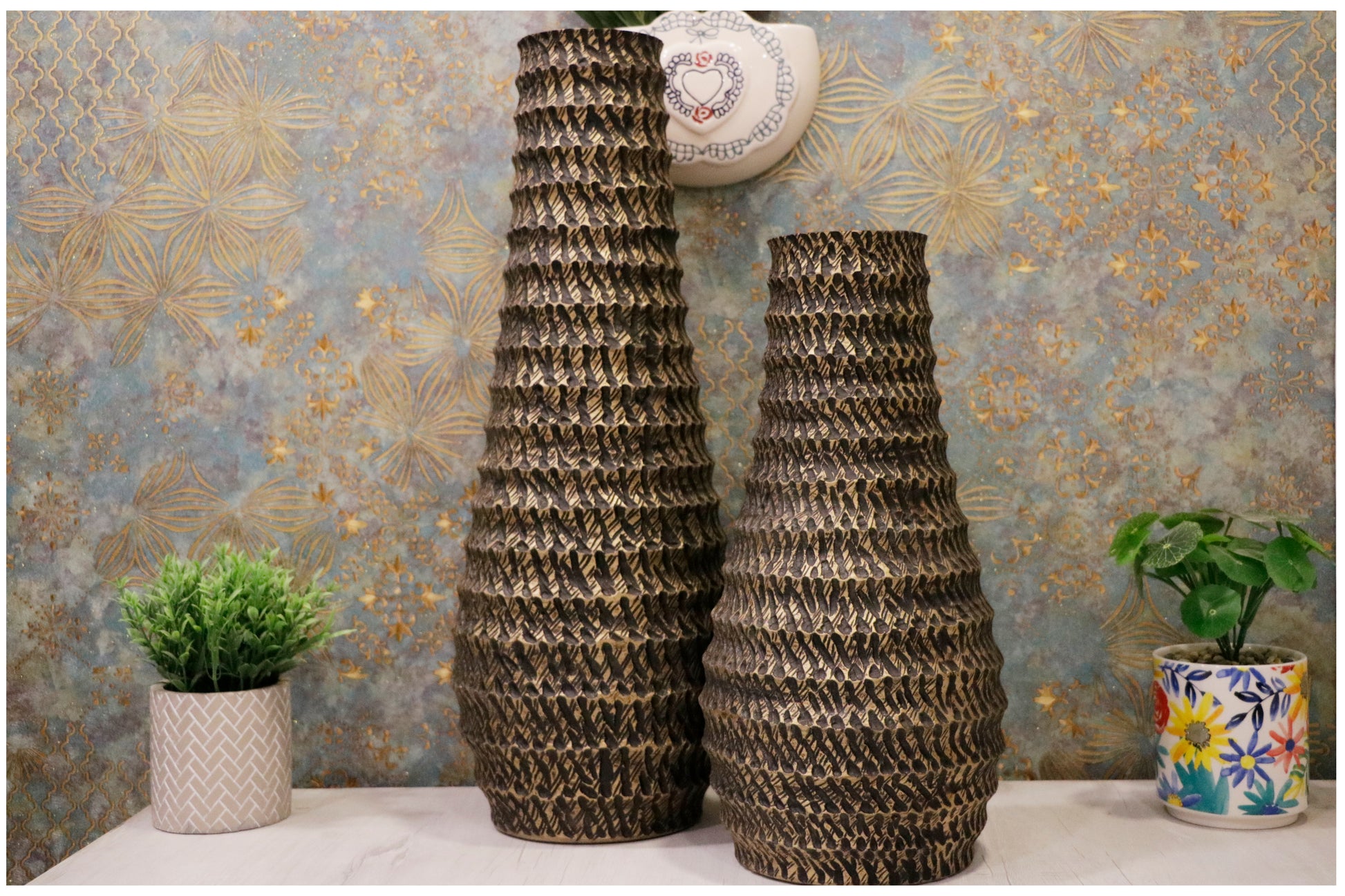 Make a bold statement in your home with the Sierra Textured Metal Vase. Sculpted with layered ridges and finished in a striking blend of bronze and matte black, this tall vase commands attention with its dramatic form and intricate surface. The hand-crafted texture creates depth and dimension, making it a standout piece whether placed solo or styled with tall stems.